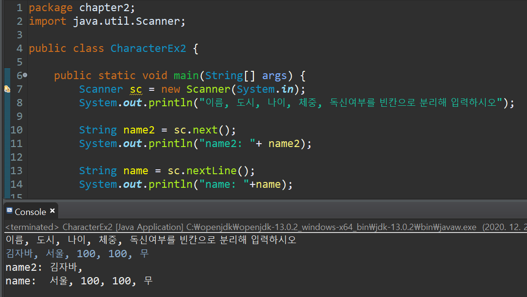 여기서 nextLine은 공백도 받겠다는 뜻이다. 직접 sc.next()에 공백을 넣어서 입력을 받아보자 어떤 결과가 나오는지 해보길 바란다.