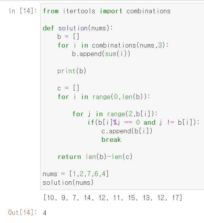 배열 nums이 매개변수로 주어지고 nums에 있는 숫자들 중 서로 다른 3개의 수를 골라 더했을 때 소수가 되는 경우의 개수를 return.