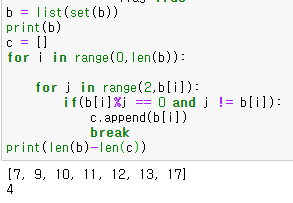배열 C에 "소수가 아닌것들" 을 넣고 len(b)에서 len(c)를 했음.