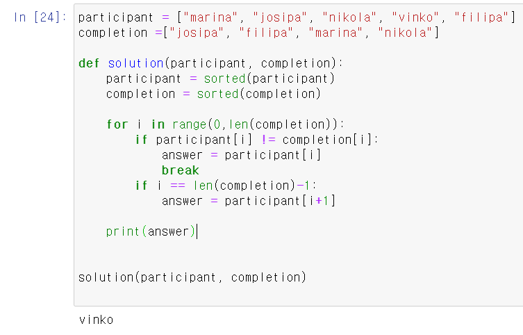 - 참가자 배열 participant 완주자 배열 completion이 있음.