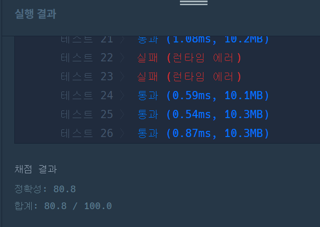 테스트 케이스 2, 22, 23의 런타임 에러만이 남았다..ㅠㅠ 실패는 다 해결했으니.. 배열 인덱스가 문젠가?