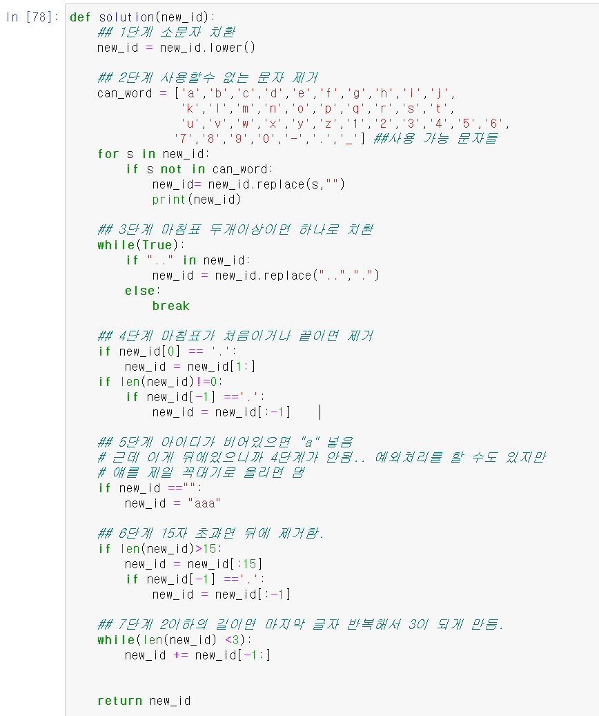 예시가 "=.=" 일때 4단계를 할때 시작이 "." 이 되므로 이걸 제거해버리니까 배열이 비어버려서 new_id[-1]이 배열범위를 벗어난다고 뜨는거임!! 그러면 여기다가 예외를 적용시켜주면 될듯.