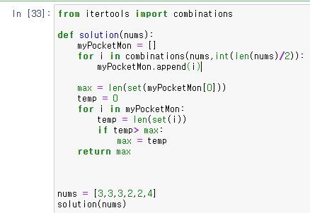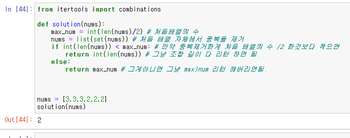- 최대한 다양한 종류의 포켓몬을 가지는 조합을 짜고 그 종류 갯수를 리턴.