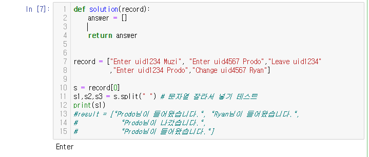 - 채팅방에 오고가거나 닉네임을 변경한 기록이 담긴 record가 매개변수로 주어질 때, 최종적으로 방을 개설한 사람이 보게되는 메세지를 문자열 배열형태로 리턴.